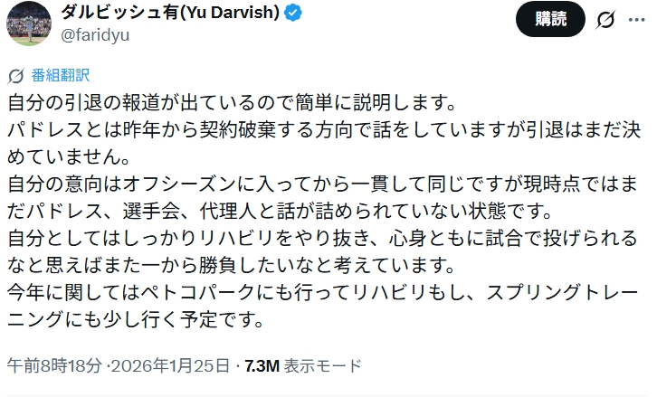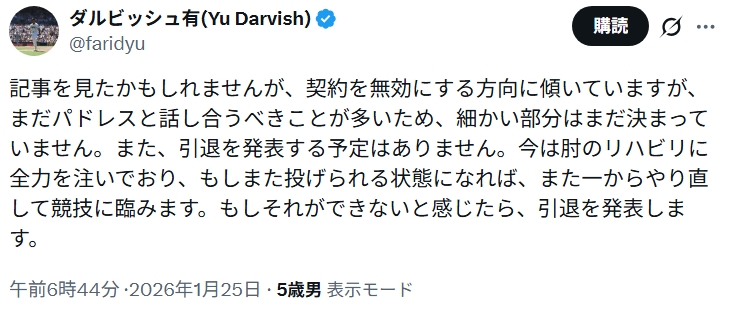 ダルビッシュ選手は、「パドレスとは契約を解除(無効化)する方向で話しているのは事実だが、引退はまだ決めていない」とはっきり否定しました。