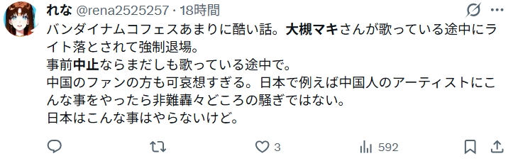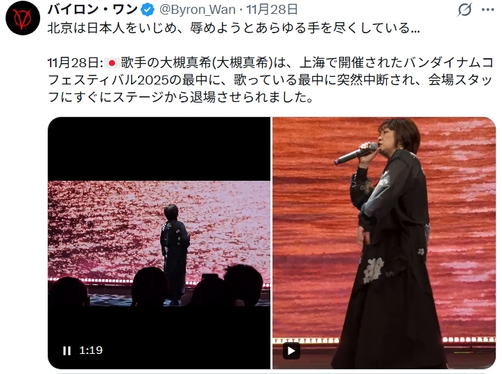 2025年11月28日、上海で開催されたバンダイナムコフェスのステージで、大槻マキさんが歌唱中に 照明と音声が突然カットされ、ステージが強制終了させられました。