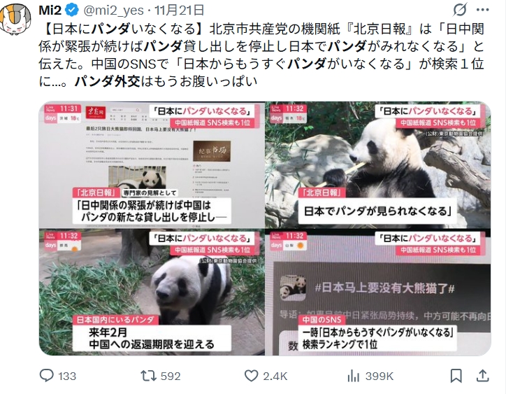 日本で見られるパンダはすべて中国から貸し出されている“レンタル”です。